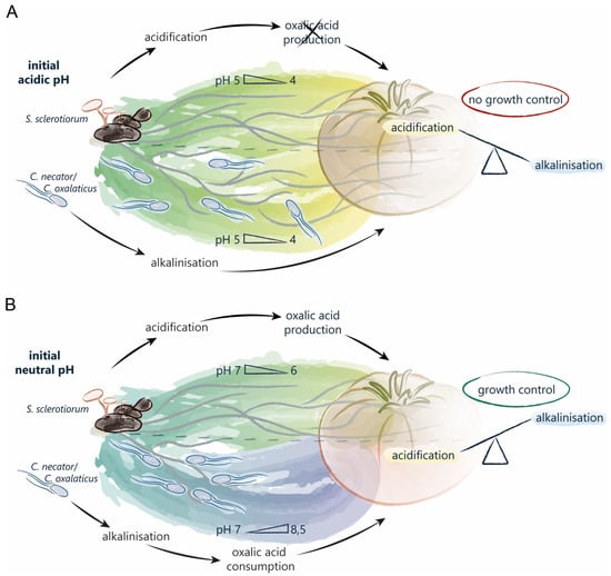 Figure 5. Schematic representation of the relationship between pH and fungal growth control by oxalotrophic bacteria when the initial pH is acidic (A) or neutral (B). With an acidic initial pH (A), S. sclerotiorum acidifies the medium but does not produce oxalic acid. Oxalotrophic bacterial metabolism is not sufficient to alkalinize the medium; therefore, fungal growth is not controlled. When the initial pH is neutral (B), S. sclerotiorum produces oxalic acid to acidify the medium. The combined action of oxalic acid consumption and bacterial metabolism promotes the alkalinisation of the medium and results in fungal growth control.