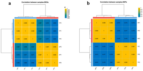 Heat maps of correlation: (a) DEGs and (b) DEPs.