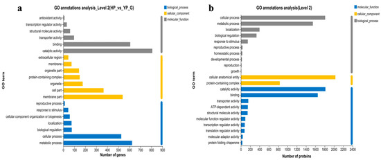 In this study, the GO functional annotation classification of DEGs and DEPs in fruiting bodies at YP vs. HP was carried out, and a statistical analysis of the results was conducted. They were divided into three classes—biological process (BP), molecular function (MF), and cellular component (CC)—describing the BP that the gene code products participate in, the MF possessed, and the cell environment involved, respectively. A statistical analysis of the gene numbers in each significantly enriched GO term was implemented, and secondary classification was performed. The first 20 terms of each class are displayed in histograms. It can be seen from Figure 3 that BP shows common significant enrichment in metabolic processes and cellular processes in YP vs. HP. For MF, key functions like catalytic activity and binding are significant. Although there are some differences in CC, the DEGs are mainly located in the membrane and cell parts, while DEPs are mainly correlated with cellular anatomical entities and the protein-containing complex. These results generally disclose important characteristics and trends regarding the DEGs and DEPs related to functions in YP vs. HP, and offer strong support for further explorations of the biological significance and functional difference.