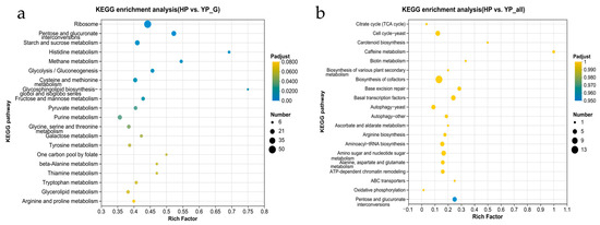 The first 20 significantly enriched KEGG pathways were carefully classified and compared according to KEGG pathway types (Figure 4). This comparative analysis discloses the significant differences in DEGs and DEPs between YP and HP regarding metabolic pathways. In the KEGG analysis of DEGs shown in Figure 4a, the main significant enrichments can be seen in ribosome, starch and sucrose metabolism, and purine metabolism. The enrichment of these pathways might suggest significant changes in the synthesis and function of ribosome, starch and sucrose metabolism, purine metabolism, and other biological processes during the growth of M. sextelata from YP to HP. Such changes have an important influence on the growth and development of M. sextelata. In the KEGG analysis of DEPs shown in Figure 4b, we mainly see significant enrichments in the biosynthesis of cofactors, cell cycle of yeast, and autophagy of yeast. Enrichments of these pathways might disclose significant changes in the synthesis and use of cofactors, cell cycle regulation, autophagy processes, and other key biological processes during the growth of M. sextelata. These changes might affect the functions and expression modes of proteins.