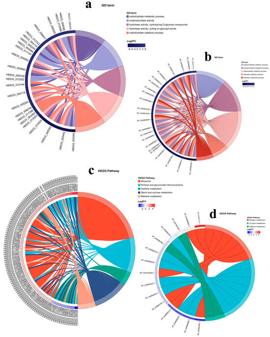 In seeking a better understanding of key genes, as well as their biological functions and regulatory network, in the YP and HP of M. sextelata, the genes that might play important roles in growth as well as their expression modes in different development phases can be identified more clearly using an enrichment chordal graph. In Figure 5, the sectors in different colors represent different biological processes. The sizes and color intensities of lines reflect the enrichment degree and expression changes in genes in a specific pathway. In Figure 5a, the top five GO terms enriched in the DEGs of YP vs. HP are the carbohydrate metabolic process, oxidoreductase activity, hydrolase activity, hydrolyzing O-glycosyl compoundshydrolase activity, acting on glycosyl bonds, and carbohydrate catabolic process, among others. In Figure 5b, the top five GO terms enriched in the DEPs of YP vs. HP are the polysaccharide catabolic process, polysaccharide metabolic process, carbohydrate catabolic process, cellulose catabolic process, and cellulose metabolic process, among others. In Figure 5c, the top five KEGG pathways enriched in the DEGs of YP vs. HP are ribosome, pentose and glucuronate interconversions, histidine metabolism, starch and sucrose metabolism, methane metabolism, and other pathways. The enrichment of these pathways reflects the diversity of energy metabolism, amino acid metabolism, and carbon metabolism during the growth of M. sextelata. In Figure 5d, the top five KEGG pathways enriched in the DEPs of YP vs. HP are nitrogen metabolism, tyrosine metabolism, caffeine metabolism, and others. The enrichment of these pathways might disclose the use and metabolism characteristics of specific nutrients during the growth of M. sextelata.