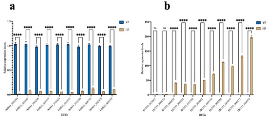 The RT-qPCR test results in Figure 6 are consistent with the key DEGs shown in the RNA-seq analysis in Supplementary Table S2, indicating that the RNA-seq results are reliable. The expression levels of the genes shown in Figure 6a were all significantly higher under theYP than under the HP. The expression levels of the genes shown in Figure 6b were all significantly higher at the HP than at theYP. The expression levels of these genes under the YP may be very low, resulting in them not being obvious or even visible in the Figure 6b. This may be due to the strong repressive effect of these genes under the YP, or the expression of these genes under the YP itself is very low. Despite the low expression levels under the YP, the up-regulation of these genes under HP was significant, suggesting that these genes may have important biological functions under the HP.