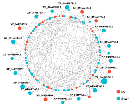 PPI network of top 200 DEPs (The size of the circle represents the level of connectivity; the larger the circle, the higher the connectivity.)