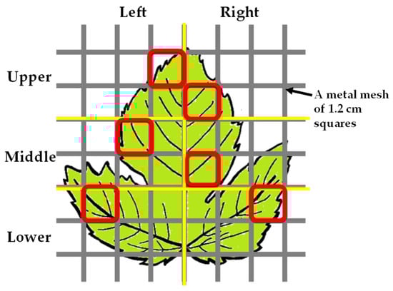 One leaf was arbitrarily selected from the specimens and was sectionalized into six areas, i.e., the left and right parts were further divided into upper, middle, and lower parts, using a metal mesh with square sections measuring approximately 1.2 cm (Figure 1). Spores were scraped from multiple uredinia or telia within a square section of the area using a surgical knife, and DNA extraction was performed. If no uredinium or telium was found in any square sections in the area, and the area was excluded from the analyses. In the case of the cultivated grapevines, DNA was extracted from the spores collected from 531 square sections of 103 specimens (Table 1), and in the case of the wild grapevines, DNA was extracted from spores collected from 166 square sections of 44 specimens (Table 2). DNA extraction was performed according to the methods described by Suyama et al. (1996) [10] and Virtudazo et al. (2001) [11]. In this study, we examined multiple DNA samples from one specimen because some of the specimens collected more than a decade ago were expected to degrade if subjected to this type of analysis.