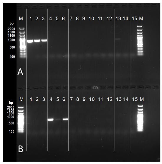 The result of the agarose-gel electrophoresis test for species-specific primers designed within the rDNA ITS 2 regions. (A) The test of the Neophysopella meliosmae-myrianthae specific-primer Pheuv1. (B) The test of the N. montana specific-primer PmontF. The primer NL4 (O’Donnell, 1993 [12]) was used as a reverse primer in both of the tests. 1–3: N. meliosmae-myrianthae (880 bp, IBAR 10494, 10485, and 10473, respectively), 4–6: N. montana (740 bp, IBAR 10455, 10463, and 10460, respectively), 7: Pestalotiopsis sp., 8: Aspergillus sp., 9: Colletotrichum sp.1, 10: Colletotrichum sp. 2, isolated from a fruit of grape, 11: Plasmopara viticola, 12: Pestalotiopsis sp. isolated from leaf of grapevine, 13: N. ampelopsidis (on Ampelopsis glandulosa var. heterophylla), 14: N. vitis (on Parthenocissus tricuspidata), 15: SDW, M: DNA marker.