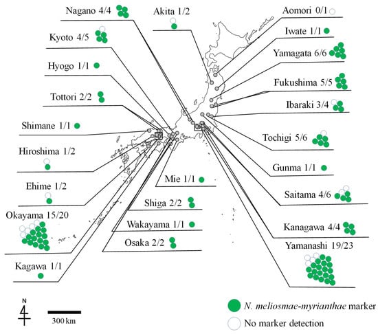 The distribution of DNA markers of Neophysopella meliosmae-myrianthae detected in the rust-infected specimens of Vitis cultivars in 24 prefectures of Japan. Numerals separated by a slash are the numbers of the specimens in which N. meliosmae-myrianthae markers were detected (left) and the total numbers of the rust-infected specimens examined (right). Colored circles indicate the result of DNA marker detection. Neophysopella meliosmae-myrianthae was detected, but N. montana was not.
