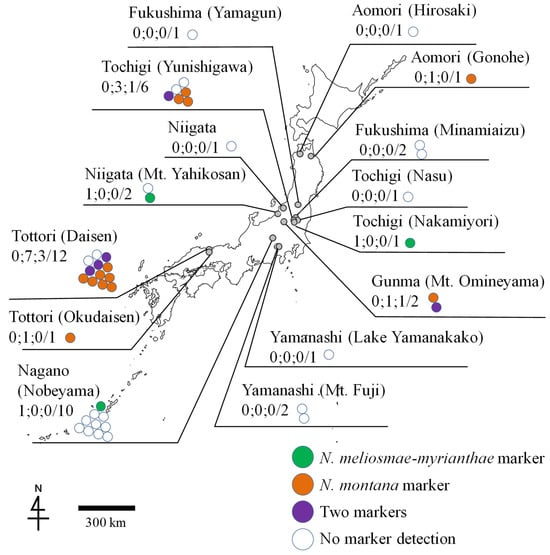 The distribution of DNA markers of Neophysopella species detected in the rust-infected specimens of Vitis coignetiae collected at 15 sites in eight prefectures of Japan. Numerals separated by semicolons are the numbers of specimens in which the DNA markers of Neophysopella species were detected: N. meliosmae-myrianthae markers (left), N. montana markers (center), and markers both of N. meliosmae-myrianthae and N. montana (right). The total number of the rust-infected specimens examined are shown on the left of a slash. Colored circles indicate the result of DNA marker detection.