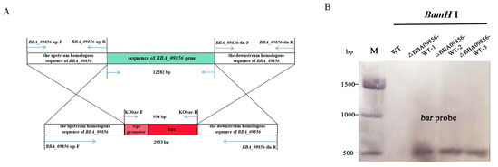 Validation of the recombinant vector. (A) Gene knockout schematic diagram. (B) Southern blot hybridization of the three ∆BBA09856-WT mutants and the wild type using a bar probe. Genomic DNA was digested with BamHI. Sizes of DNA markers (Trans 15 K) are shown in bp on the left.