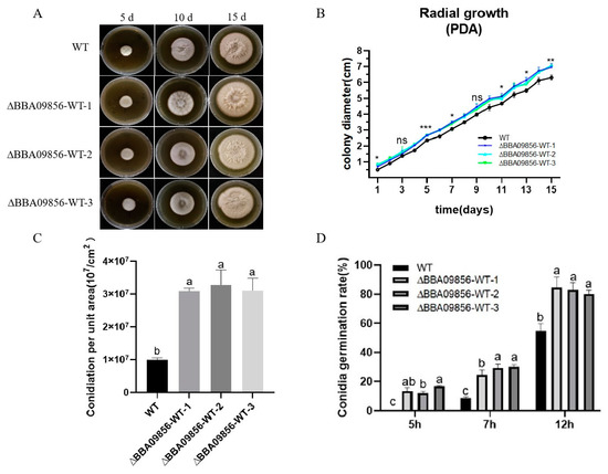 In terms of macromorphology, no significant differences were observed between the three mutant strains of ∆BBA09856-WT and the wild-type (WT) strain during the early developmental stages. However, in the later stages, the surfaces of all three mutant strains of ∆BBA09856-WT exhibited a pale yellow appearance (Figure 2A). During the 15 d of culture, there was no significant difference in the growth rate of the three mutant strains of ∆BBA09856-WT compared to that of the wild-type (WT) strain in the initial phase. However, the growth rate increased significantly in the later stages (Figure 2B). The spore production rates of the three mutant strains of ∆BBA09856-WT were significantly higher than that of the WT strain (3.09 × 107/cm2, 3.28 × 107/cm2, 3.11 × 107/cm2 vs. 9.95 × 106/cm2, p < 0.001) (Figure 2C). The spores of all the mutant strains of ∆BBA09856-WT germinated 2 h earlier than those of the WT strain, which germinated after 7 h in a shaking culture. After 12 h of shaking culture, the three mutant strains of ∆BBA09856-WT exhibited spore germination rates of 84.53%, 82.78%, and 80.20%, respectively, in contrast to the WT strain, which displayed a germination rate of 54.72% (Figure 2D). These results indicated that the three mutant strains ∆BBA09856-WT had a significantly higher germination rate (p < 0.001).