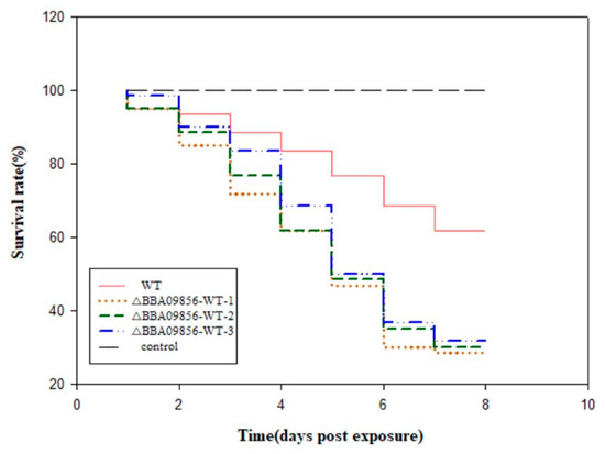 Utilizing conidia to infect third-instar larvae of O. furnacalis demonstrated a declining trend in the accumulated survival rates of these larvae over time (Figure 3). The survival rates of O. furnacalis infected by the WT strain and the three mutant strains of ∆BBA09856-WT were 61.66% vs. 28.33%, 30.00%, and 31.67%, respectively, after 8 d. The pathogenicity of the three mutant strains of ∆BBA09856-WT was significantly higher than that of the WT strain. This finding indicated that the pathogenicity of the three mutant strains of ∆BBA09856-WT towards the third-instar larvae of O. furnacalis was significantly higher than that of the WT strain. Furthermore, O. furnacalis exhibited muscardine cadavers on the fifth day of infection with the three mutant strains of ∆BBA09856-WT, whereas muscardine cadavers appeared on the seventh day with the wild-type strain WT.