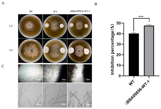 The results of the dual culture test indicated that the mutant strain ∆BBA09856-WT exhibited a stronger antagonistic effect against the gray mold pathogen, B. cinerea, compared with that of the WT strain (Figure 4A). The inhibitory rates of the WT strain and the mutant strain ∆BBA09856-WT against B. cinerea were 40.25% and 47.65%, respectively (p < 0.001) (Figure 4B). Microscopic observations revealed that the mutant strain ∆BBA09856-WT significantly altered the apical morphology of B. cinerea hyphae, resulting in a visibly shriveled and thickened appearance (Figure 4C).