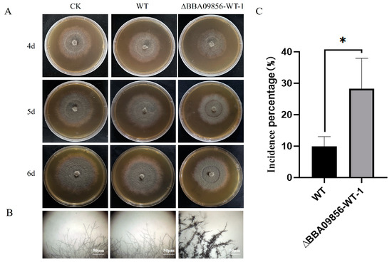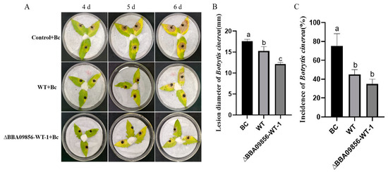 The average diameters of B. cinerea disease lesions in the treatment groups Bc (B. cinerea), WT+Bc, and ∆BBA09856-WT+Bc were 17.60 mm, 15.26 mm, and 12.16 mm, respectively, six days after inoculation (Figure 6B). Statistical analysis showed significant differences in lesion sizes between the WT+Bc and ∆BBA09856-WT+Bc groups (p < 0.05).