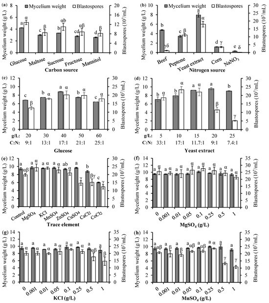 - Cliquet, S.; Jackson, M.A. Impact of carbon and nitrogen nutrition on the quality, yield and composition of blastospores of the bioinsecticidal fungus Paecilomyces fumosoroseus. J. Ind. Microbiol. Biotechnol. 2005, 32, 204–210. [Google Scholar] [CrossRef] [PubMed]