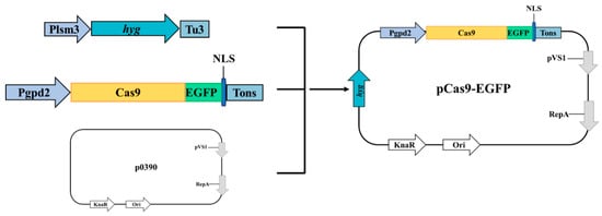 The initial construction utilized p390-blpR-cmcas9-gfp as the template []. Primers p0390R1/Pgpd2F were used to amplify the p0390-Cas9 fragment. The Plsm3 promoter and Tu3 terminator were amplified using primers Plsm3-F/R and Tu3-F/R, respectively, and the hygromycin resistance gene (hyg) was amplified from pAN7-1 using primers HYG-F/R.