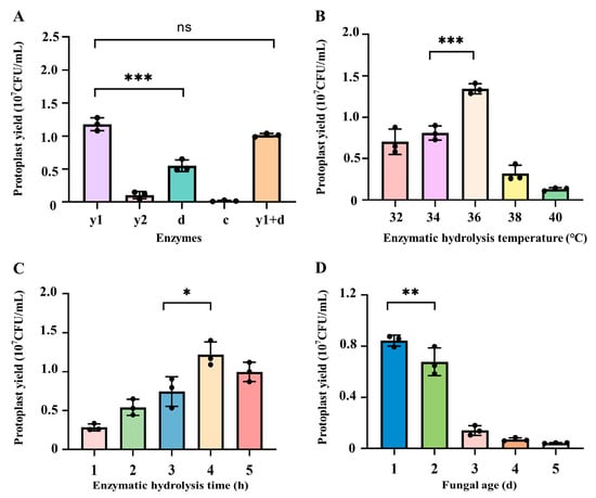 Influence of different factors on the preparation of protoplasts from C. cicadae. (A) Types of enzymes: y1: 1.5% lywallzyme, y2: 1.5% lyticase, d: 1.5% driselase, c: 1.5% cellulase, y1 + d: 0.75% lywallzyme and 0.75% driselase; (B) enzymatic hydrolysis temperature; (C) enzymatic hydrolysis time; (D) fungal age. Values are presented as mean ± SD (n = 3). Significance analysis between two different groups: * p < 0.05, ** p < 0.01, and *** p < 0.001, ns indicates no significance.