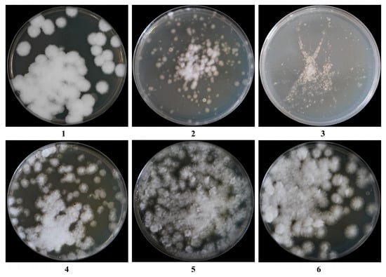 Effects of different regeneration media on protoplasts regeneration: (1): PDA, (2): PDA + KCl, (3): PDA + NaCl, (4): PDA + glucose, (5): PDA + sucrose, and (6): PDA + mannitol.