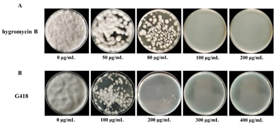 Sensitivity of wild C. cicadae in the PDA medium of hygromycin B (A) and G418 (B) cultured at 26 °C for 7 d.