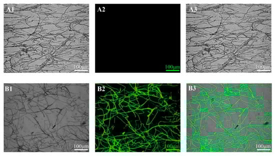 Laser scanning confocal microscope images of C. cicadae mycelia, among which (A1–A3) represent the control strain without plasmid and (B1–B3) represent pCas9-EGFP transformants, respectively. Bright field images (A1,B1), fluorescent images (A2,B2), merged images (A3,B3). (A3,B3) are merged images of (A1,A2) and (B1,B2), respectively. The bars = 100 µm.