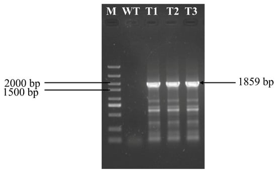 Identification of transformants (M: marker; WT: wild-type strain; T1, T2, and T3: transformants 1, 2, and 3, respectively).