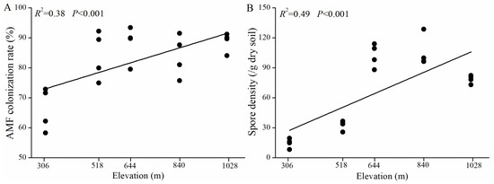 Linear correlations between elevation and AMF colonization rate (A) and spore density (B) of H. miconioides.