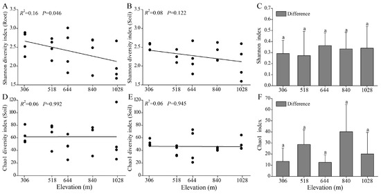 Linear correlations between elevation and alpha diversity indices (Shannon and Chao1) in root (A,D), rhizosphere soil (B,E), and their differences (C,F) in H. miconioides. Data are presented as means ± SD. Significant differences are denoted by lowercase letters (p < 0.05).