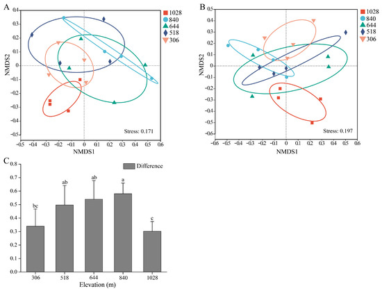 The NMDS analysis based on Bray–Curtis distances and Adonis tests at the OTU level revealed significant differences in the AMF community structure along elevation gradients in both the root (R2 = 0.32; p = 0.015) and rhizosphere soil samples (R2 = 0.26; p = 0.044) (Figure 5A,B). The AMF communities at the 1028 m elevation were distinctly separated from those at 840 m and 518 m. In the root samples, significant species differences were also observed between 840 m and 306 m elevations. In the rhizosphere soil, the 1028 m elevation community significantly differed from the 306 m elevation community. Interestingly, differences in AMF beta diversity between the root and rhizosphere soil initially increased and then decreased with elevation (Figure 5C). These results clearly distinguish between AMF communities in higher and lower elevations.