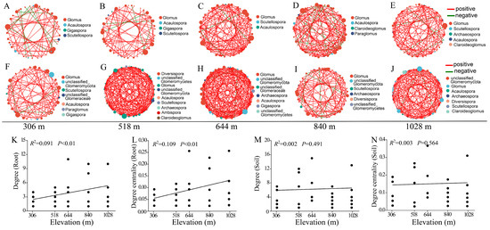 The co-occurrence networks analysis of AMF community along elevation gradients. The changes in the AMF community co-occurrence networks in the root at 306 m (A), 518 m (B), 644 m (C), 840 m (D), and 1028 m (E) elevation. The changes in the AMF community co-occurrence networks in the rhizosphere soil at 306 m (F), 518 m (G), 644 m (H), 840 m (I), and 1028 m (J) elevation. Linear correlations between elevation and topological parameters of the AMF community co-occurrence networks in the root (K,L) and rhizosphere soil (M,N) of H. miconioides. The positive and negative correlations are indicated by red and blue lines, respectively.