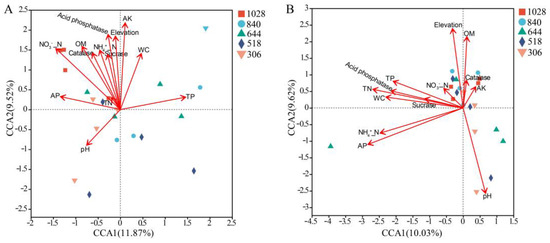 Canonical correspondence analysis (CCA) plots of AMF community compositions and soil properties in root (A) and rhizosphere soil (B) based on OTU abundance along elevation gradients.