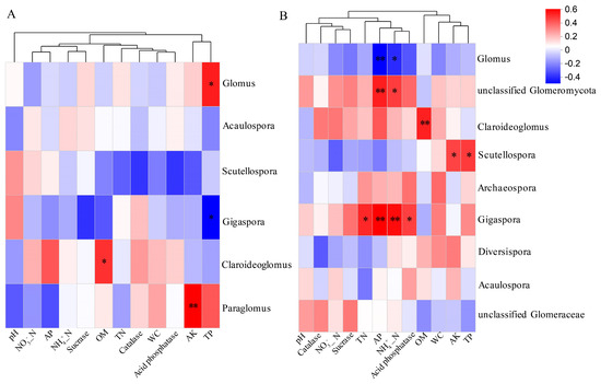 Pearson correlations between AMF communities at genus level in root (A) and rhizosphere soil (B) along elevation gradients. * p < 0.05; ** p < 0.01.