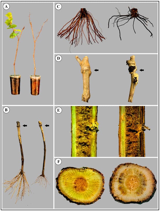 Symptoms of root and trunk rot in grapevine plantlets cv. Syrah grafted onto IAC766 under cold storage. Healthy plant material is always shown on the right side and diseased plant material on the left side. (A) Whole plantlet showing branching and diseased plantlet without leaves. (B) Normal roots on a healthy plantlet and rotten roots on a diseased plantlet. (C) Healthy and diseased roots. (D) Callus formed in the junction between the scion and the rootstock in healthy and diseased plantlets. (E) Longitudinal section in the vascular tissue of healthy and diseased plantlets showing darkening. (F) Cross sections in healthy and diseased vascular bundles of the trunk showing darkening due to the disease. Black arrows indicate the junction between scion and rootstock.
