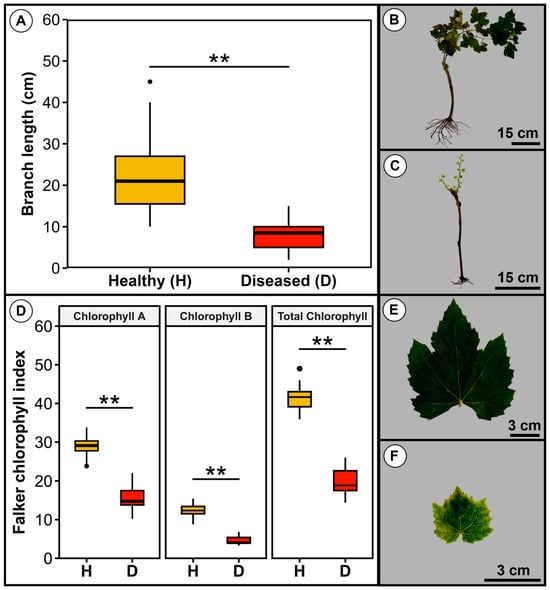 Sprouting and chlorophyll content in healthy—H and diseased—D plantlets of cv. Syrah grafted onto IAC766 rootstocks. (A) Branch length in 100 healthy and 100 diseased plantlets. (B) Visual aspect of a sprout in a healthy plantlet. (C) Sprouts in a diseased plantlet. (D) Chlorophyll content in 100 healthy and 100 diseased plantlets, with the measurement of 3 leaves per plantlet. (E) Aspect of a leaf in a healthy plantlet. (F) Leaf on a diseased plantlet. Asterisks indicate significant differences according to the t-test at 1% probability. Scale bars are shown at the lower right corner of figures in the right panel.