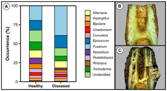 3.2. Fusarium Was the Most Prevalent Genus in Both Healthy and Diseased Plantlets