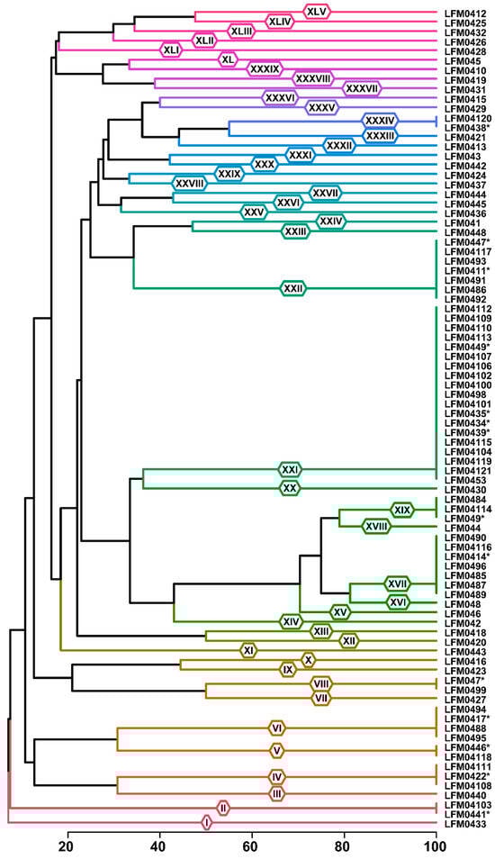 BOX-PCR dendrogram of Fusarium strains generated with Jaccard’s distance in the unweighted pair group method with arithmetic averages (UPGMA). The roman numerals on the branches represent the BOX-PCR groups. The scale represents the similarity in percentage and the BOX groups were defined on the basis of 100% similarity. Strains marked with asterisks were used in the pathogenicity tests in groups composed of more than one strain.