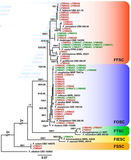 Phylogenetic tree of the Fusarium species inferred with the maximum likelihood (ML) and Bayesian inference (BI) methods with tef1 sequences and the GTR + G model for both methods. The bootstrap analysis was performed with 1000 resamplings. The numbers on the nodes represent the bootstraps in ML analysis followed by the posterior probabilities (PP) in the Bayesian inference. Values lower than 70% in ML and lower than 0.95 PP in BI were not taken into consideration for branch support. Although the tef1 gene of 79 strains was sequenced and all strains are shown in the phylogenetic tree, only one representative of identical sequences was deposited in the databases. Therefore, the evolutionary analysis involved a total of 65 distinct sequences with 673 bps of aligned nucleotides. Only sequences from type material available in the databases were used for comparison purposes and are listed in Table S1. Strains from healthy plantlets are indicated in green and the ones from diseased plantlets are in red. Fusarium albidum (syn. Luteonectria albida) was used as an outgroup and the species complexes are indicated with different colours. The scale indicates the number of substitutions per site.
