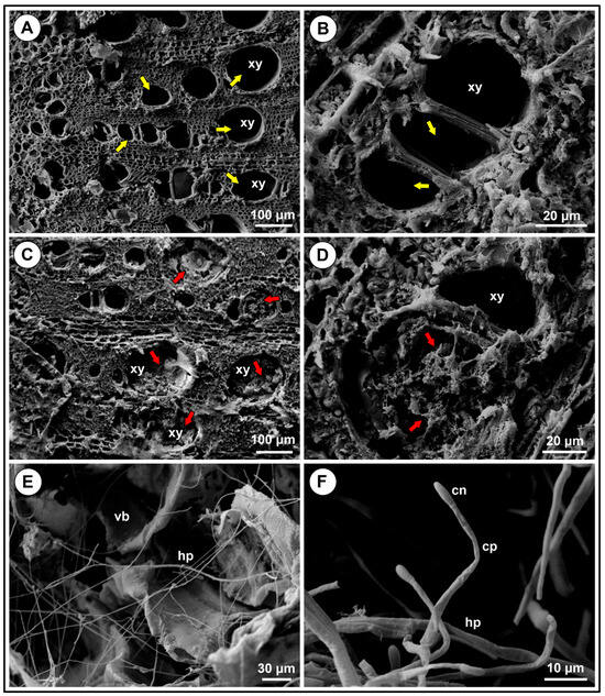 Scanning electron microscopy (SEM) images of xylem vessels of cv. Syrah grafted onto IAC766 rootstock. (A,B) Root xylem vessels of healthy plantlets showing the lumen of the vessels. (C,D) Root xylem of diseased plantlets. (E,F) Xylem vessels of diseased plantlets colonised by Fusarium. Abbreviations are xy = xylem, hp = hyphae, vb = vascular bundle, cn = conidium, and cp = conidiophore. Yellow arrows indicate the xylem in healthy tissues and red arrows show clogged xylem vessels in diseased plantlets. Scale bars are shown at the lower right corner of the figures.