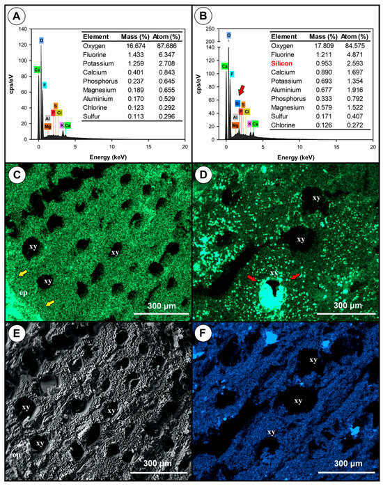 Energy-dispersive X-ray spectroscopy (EDS) of healthy and diseased root tissues of grapevine cv. Syrah grafted onto IAC766 rootstock. (A,B) EDS quantification of minerals in healthy and diseased tissues. (C,D) Distribution of Ca in healthy (C) and diseased (D) tissues; yellow arrows show concentration in the epidermis of healthy tissue and red arrows show concentration in the xylem. (E,F) Presence and distribution of Si in healthy and diseased tissue; lack of Si in healthy tissue (E) and Si evenly distributed in diseased tissue is indicated by the blue colour (F). Abbreviations are xy—xylem and ep—epidermis; scale bars are shown at the lower right corner of the microscopy figures.