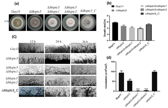 3.3. ∆Moptc5∆Moptc1 and ∆Moptc5∆Moptc2 Strongly Affect the Hyphal Growth and Sporulation of M. oryzae