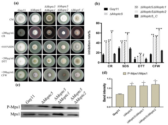 3.4. MoPTC5, MoPTC1, and MoPTC2 in Cell Wall Maintenance and Mps1 Phosphorylation Level