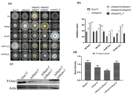 3.6. Moptc5, Along with Moptc1 and Moptc2, Plays Important Roles in Osmotic, Oxidative Stress, and MoOsm1 Phosphorylation in M. oryzae
