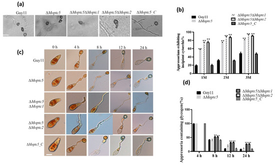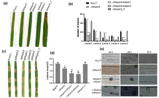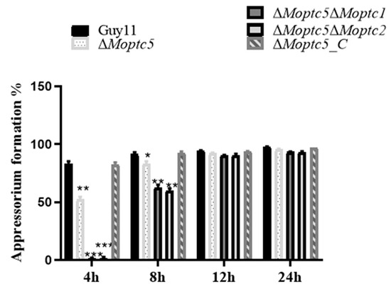 3.7. ∆Moptc5∆Moptc1 and ∆Moptc5∆Moptc2 Mutants Are Remarkably Delayed in Appressoria Formation
