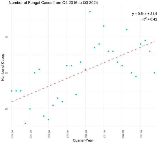 A linear regression model showed a significant increase in fungal cases from quarter 4 (Q4) of 2016 to quarter 3 (Q3) of 2024 (p < 0.0001). Q: quarter.