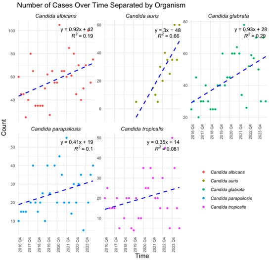 Linear regression models separated by each Candida species. There were significant increases in cases of C. albicans (p = 0.0121), C. auris (p = 0.0007), and C. glabrata (p = 0.0014) over the eight years of the study period. Q: quarter.