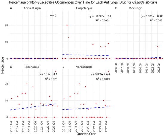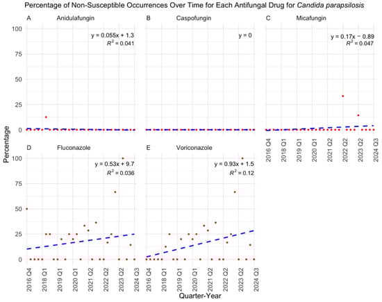 Percentage of non-susceptible occurrences over time for each antifungal drug in treating Candida parapsilosis with results of a linear regression model. C. parapsilosis remained largely susceptible to echinocandins (A–C). Although the increase in fluconazole and voriconazole resistances were not statistically significant (p = 0.346 and p = 0.074, respectively), a gradual upward trend was observed (D,E). Q: quarter.