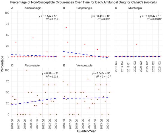 Percentage of non-susceptible occurrences over time for each antifungal drug in treating Candida tropicalis with results of a linear regression model. C. tropicalis remained largely susceptible to echinocandins with sporadic resistant isolates (A–C). More fluctuating susceptibility to fluconazole and voriconazole were observed with demonstrated elevated MIC values (D,E). Q: quarter.