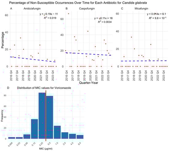Percentage of non-susceptible occurrences over time for each antifungal drug in treating Candida glabrata with results of a linear regression model. Echinocandins remained largely effective against C. glabrata, though fluctuations in susceptibility were noted over time (A–C). 47.7% (135/283) of C. glabrata isolates had MIC values below epidemiological cutoff value (ECV, red solid line) of 0.25 µg/mL, while the majority exhibited elevated MICs (D). Q: quarter.
