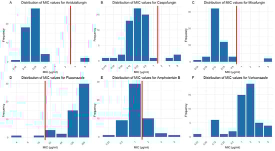 Distribution of MIC values for Candida auris when treated with various antifungals. C. auris demonstrated high MIC values against fluconazole (69/75 isolates, 92%, MIC ≥ 32 µg/mL) followed by amphotericin B (19/75 isolates, 32.2%, MIC ≥ 2 µg/mL) (D,E). Fewer isolates displayed elevated MICs for other antifungals (A–C). Red solid lines are the CDC’s tentative breakpoints (CDC-BP) for anidulafungin, caspofungin, fluconazole, and amphotericin B, as well as the ECV for micafungin. No CDC-BP or ECV for voriconazole is available (F).