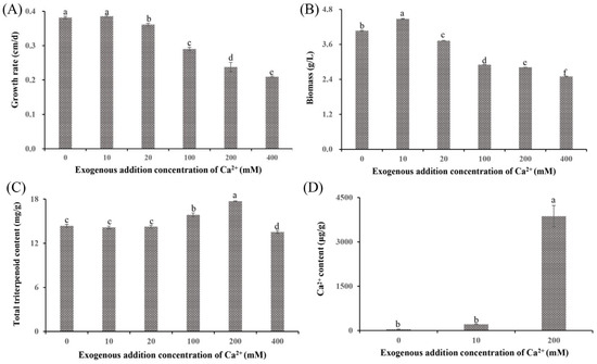 Growth characteristics and total triterpenoid content of Sanghuangporus baumii mycelia treated with various concentrations of Ca2+. (A) Mycelial growth rate; (B) biomass; (C) total triterpenoid content in S. baumii mycelia; (D) Ca2+ content in S. baumii mycelia. Different letters share significant difference, p < 0.05.