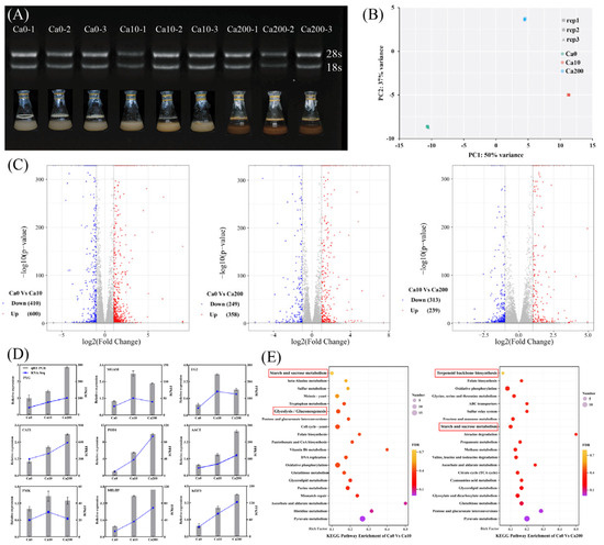 Transcriptome analysis to analyze the differences in growth characteristics and metabolite synthesis between Sanghuangporus baumii mycelia treated with various Ca2+ concentrations. (A) RNA gel electrophoresis of nine samples (three replicates each of the 0 mM Ca2+ [Ca0], 10 mM Ca2+ [Ca10], and 200 mM Ca2+ treatment groups [Ca200]); (B) PCA score plot of transcript profiles of the Ca0, Ca10, and Ca200 groups; (C) volcano plot of upregulated and downregulated genes identified in pairwise comparisons; (D) qRT-RCR validation of gene expression; (E) KEGG enrichment analysis of DEGs from pairwise comparisons.