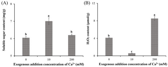 Soluble sugar and H2O2 content of Sanghuangporus baumii treated with various Ca2+ concentrations. (A) Soluble sugar content; (B) H2O2 content. Different letters share significant difference, p < 0.05.