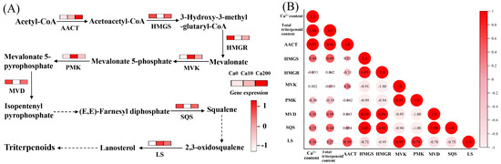 Ca2+-induced biosynthesis of triterpenoids in Sanghuangporus baumii. acetyl-CoA acyltransferase, AACT; 3-hydroxy-3-methylglutaryl-CoA synthase, HMGS; 3-hydroxy-3-methylglutaryl-CoA reductase, HMGR; mevalonate kinase, MVK; phosphomevalonate kinase, PMK; mevalonate pyrophosphate decarboxylase, MVD; squalene synthase, SQS; lanosterol synthase, LS. (A) Expression levels of genes associated with triterpenoid biosynthesis; (B) results of Pearson correlation analysis among Ca2+ content, total triterpenoid content, and expression levels of key genes involved in triterpenoid biosynthesis.